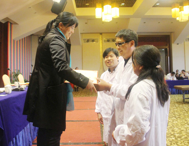 残奥冠军张春翠为获奖按摩师颁奖