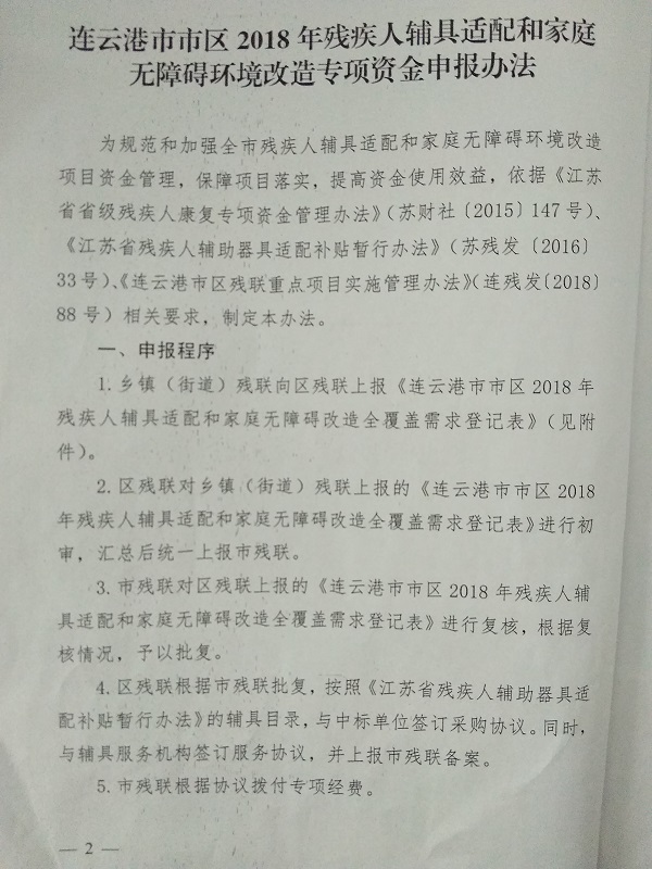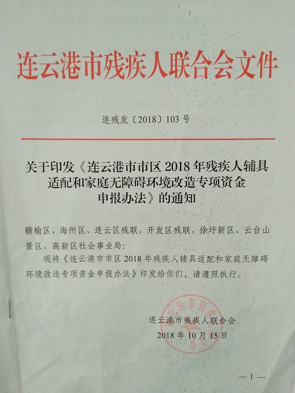 关于印发《连云港市市区2018年残疾人辅具适配和家庭无障碍环境改造专项资金申报办法》的通知
