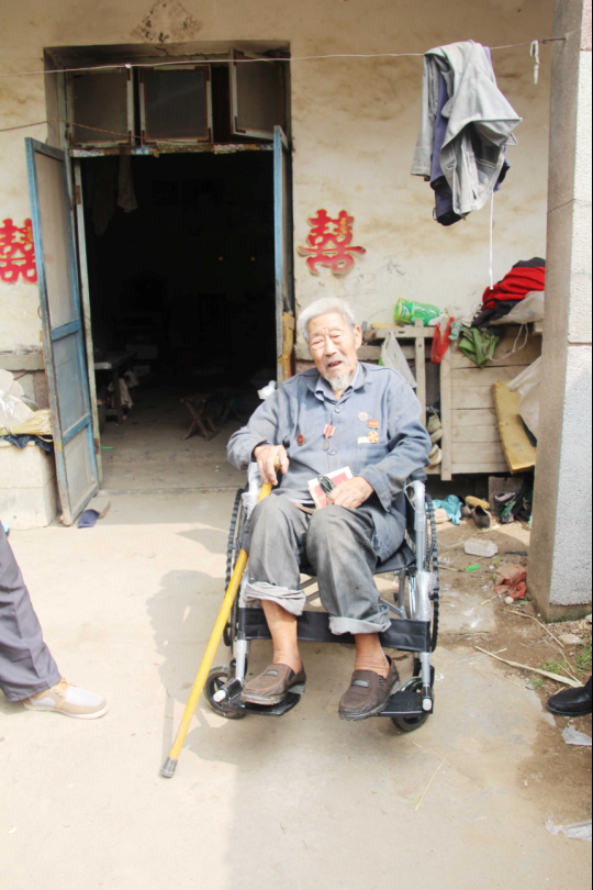 明天就是纪念抗战胜利70周年的日子了,老前辈们为了我们今天的幸福生活,历经枪林弹雨,有的甚至牺牲了宝贵的生命,郭老的这一愿望要尽快满足。今天一大早县残联许增会副理事长带就着工作人员去老古墩村看望郭老,将崭新的轮椅送到老人家里,老人和他的家人都非常高兴。老人坐在轮椅上,把他获得的军功章拿出来逐个挂在胸前拍照留念,以此纪念他那段难以忘怀的硝烟弥漫的岁月。