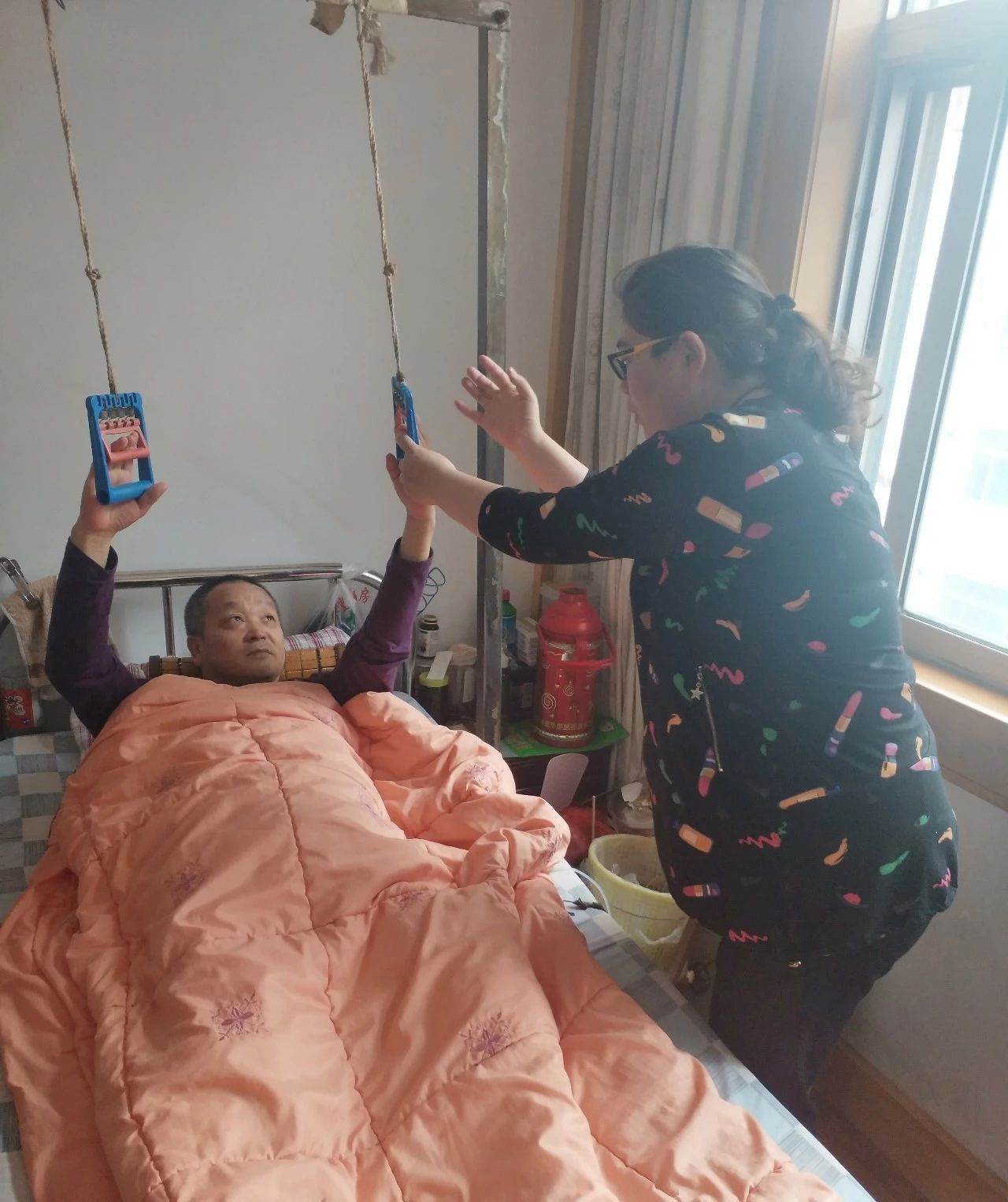 黄玉松今年63岁,瘫痪在床,生活完全不能自理,老伴也是残疾人,儿子媳妇白天外出工作无法随时照顾他们,罗仁娟和她成立的四叶草帮扶中心对黄玉松家的帮扶照顾解决了他们许多的生活难题。【出录音】罗仁娟:我对他家做的最多的是生活帮扶、救急的、助医的,例如今年,他有糖尿病,泡脚过度烫伤,我在第一时间安排医疗小分队为他安排换药的服务。后期15天换药都是由我们上门服务的。除此之外,罗仁娟他们还经常去帮助他们打扫卫生、料理家务,并辅导他们在家里安装辅具,积极复健,并且帮他们申请了生活救助,在罗仁娟的帮扶下,黄玉松和他的老伴的生活少了困顿,多了希望。【出录音】黄玉松:我们要有什么带医生给我们看看,来照顾我们,做的很好,感谢,电话号码留给我们,有什么事情我们就打电话联系,困难我们就不觉得有了,有她们来帮助我们。上楼容易下楼难,因为膝盖损毁不能弯曲,罗仁娟要单腿跳着跳下5层楼。而这只不过是她的日常工作的一个缩影。