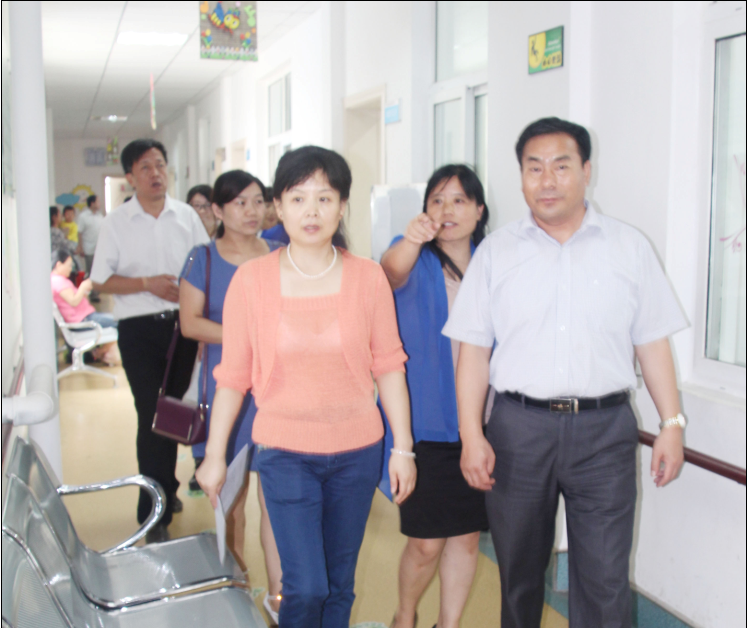 ,东海残联理事长刘再军(右一)等陪同市残联领导一行,参观残疾儿童康复室。