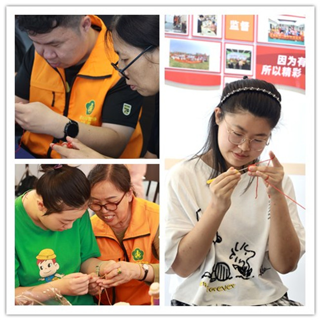通过手工编织教学活动,提升智力残疾人的手、眼协调能力和创造力,更重要的是促进他们的社会交往能力,增强自我效能感和社会归属感。有人说编织很难,普通的人都不容易学会,你怎么去教这些特殊群体,智协主席及编织非遗传承人沈海萍说:“是的,教手工真的没那么容易,普通人是一天进步一点,这些孩子能一、二个月进步一点点就是我们坚持的动力,我们会把复杂的事情拆分成简单的局部,让每个孩子都有可以做的点,提升他们自信心。还会把他们编织好的作品回收过来,去统一打开销路,定期举办义卖活动,我们原创作品“西游记手指套”系列已经寻找到了海外的销路。