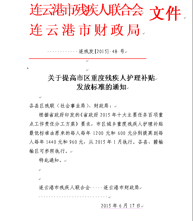 关于提高市区重度残疾人护理补贴发放标准的通知